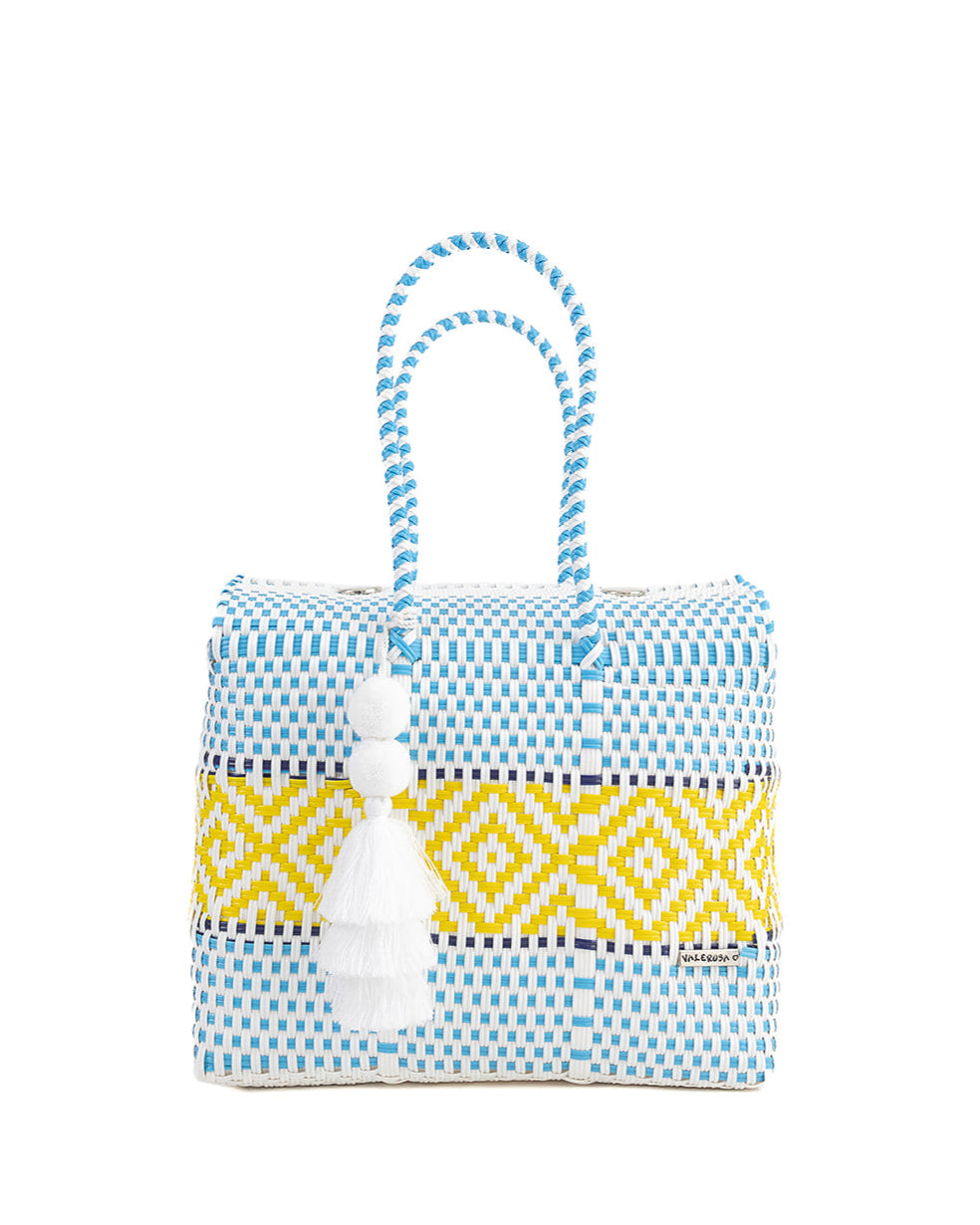 Aqua con Limon is a fresh burst of sunshine and sea breeze. With its cool sky-blue and white weave paired with a vibrant yellow diamond band, it radiates cheerful energy. The crisp white pom-pom adds a breezy finish, making this bag the perfect companion for bright days, beach escapes, and joyful adventures.