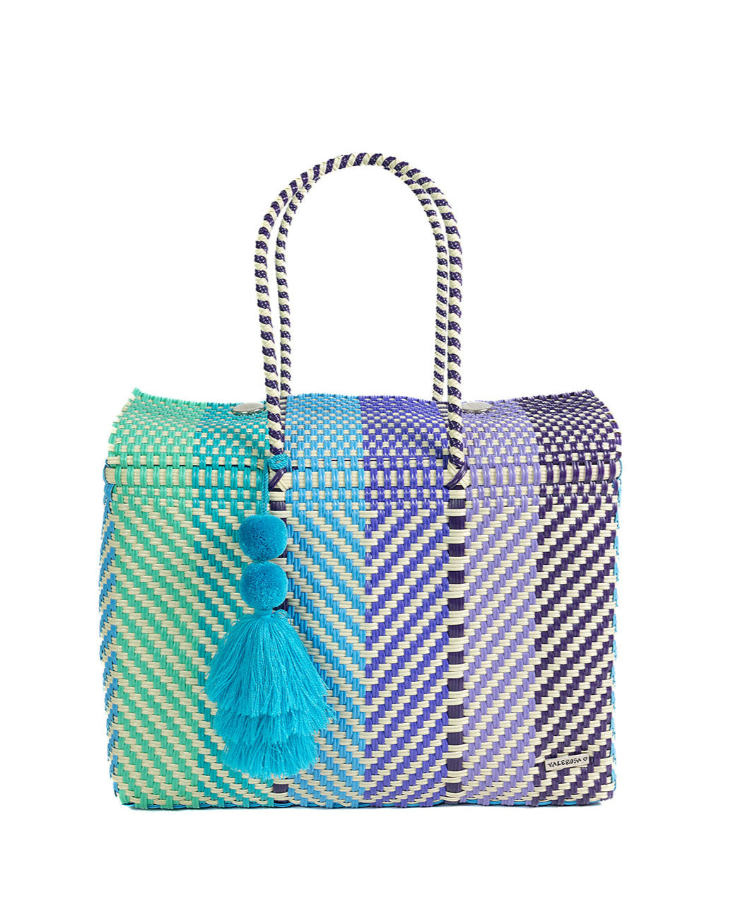 Our bags are colorful, hand-woven Mexican baskets that bring a bright, authentic style to any occasion. This bag is our largest! It is big enough for a weekend away with enough room for 2-3 outfits, shoes, make-up and more! This bag also functions perfectly as a picnic basket. Our bags are made with durable plastic that lasts a lifetime.