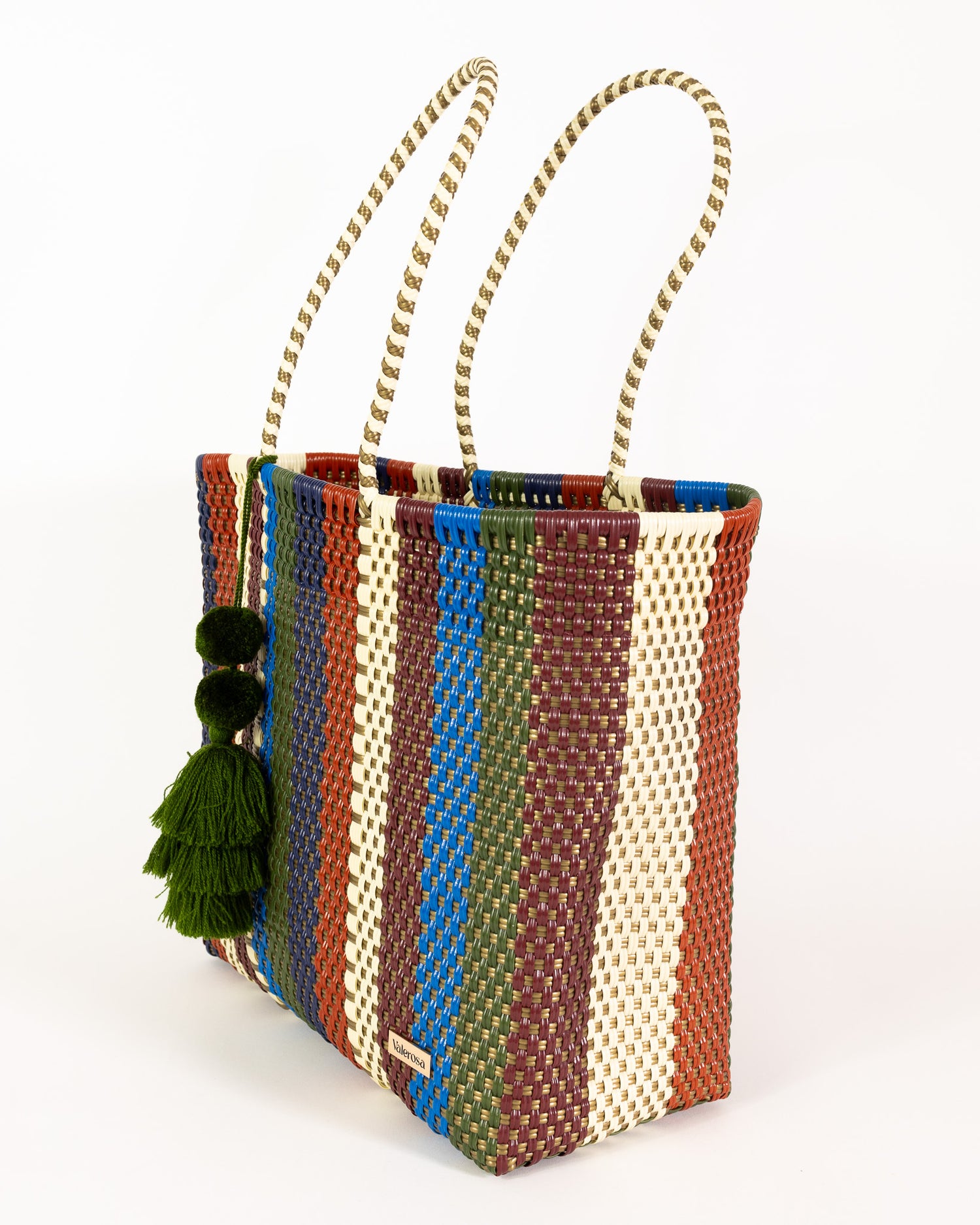 Our totes are colorful, hand-woven Mexican baskets that bring a bright, authentic style to any occasion. This bag is one of our biggest bags. Playera means "beach" in Spanish and this bag is perfect for beach/pool days. Large enough told hold 4 rolled towels, water bottle, book, phone and more! Our bags are made with durable plastic that lasts a lifetime.