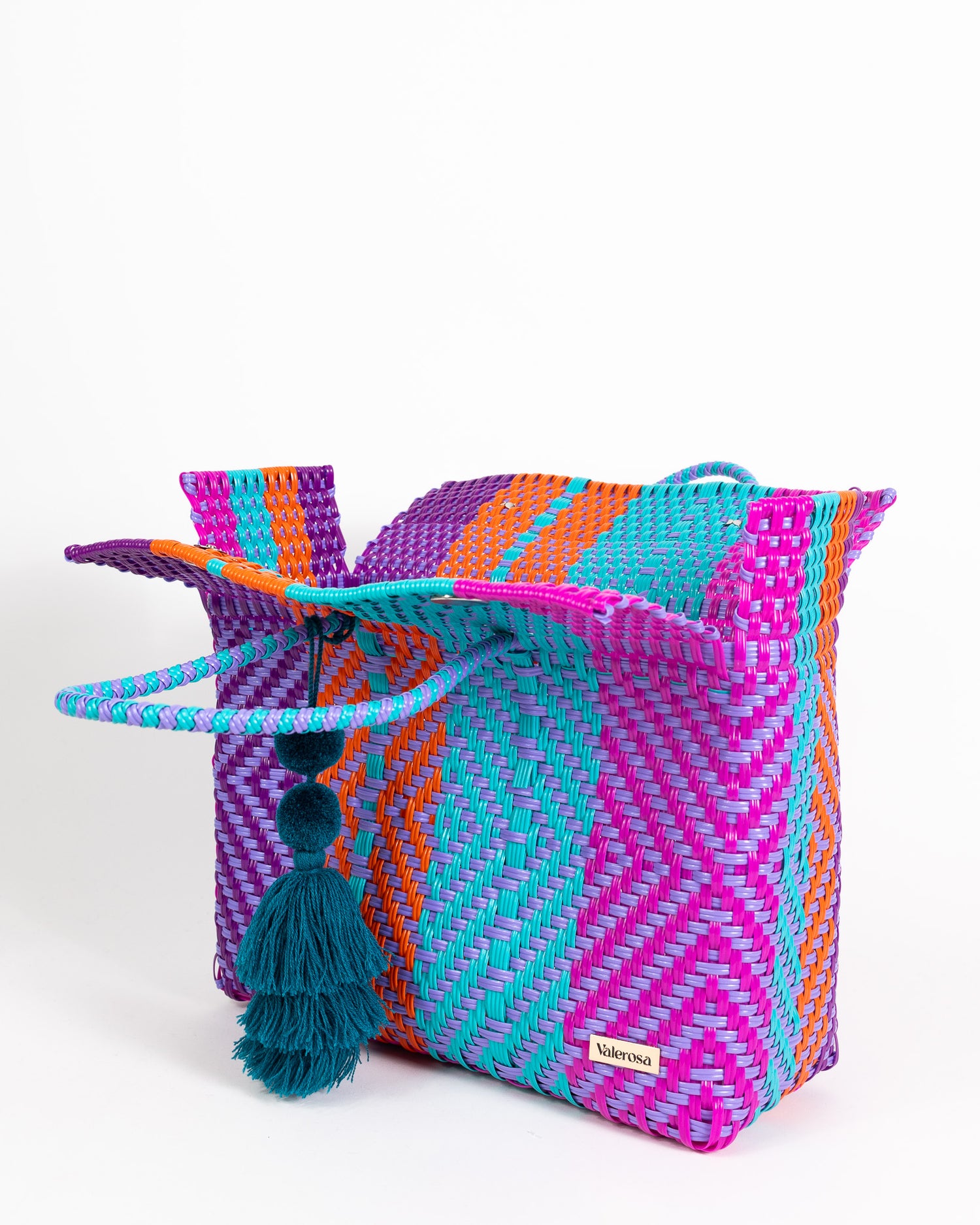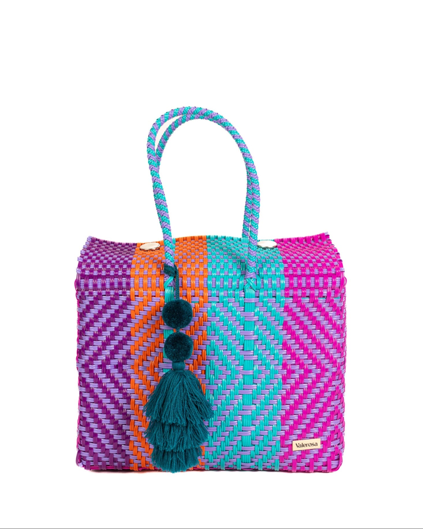 Barcelona is for the bold and vibrant souls who love to stand out. Featuring a striking mix of turquoise, orange, purple, and magenta in dynamic woven patterns, this handbag radiates energy and joy. Accented with playful pom-poms, Barcelona is the perfect statement piece to carry sunshine and color with you all year round.