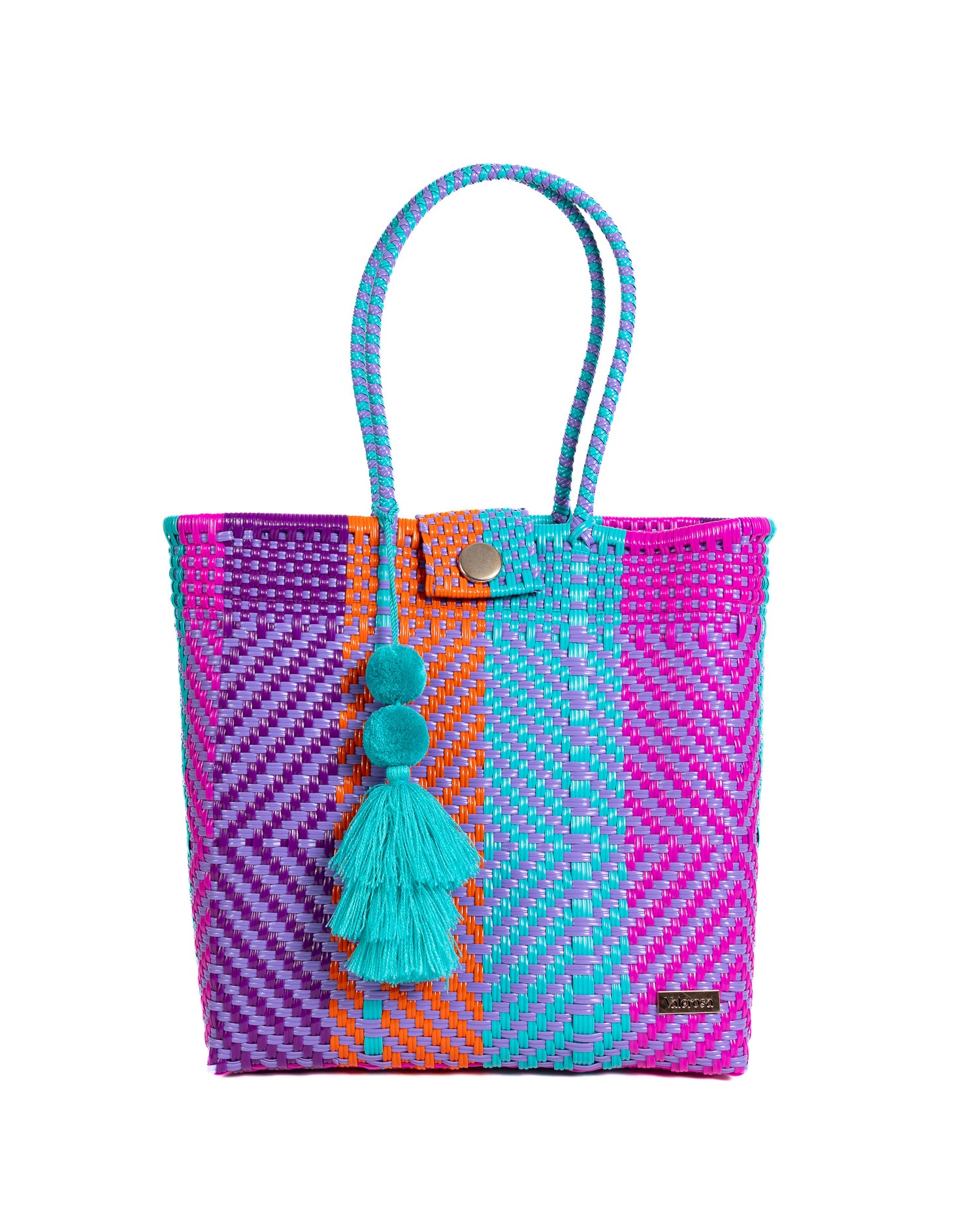 Barcelona is for the bold and vibrant souls who love to stand out. Featuring a striking mix of turquoise, orange, purple, and magenta in dynamic woven patterns, this handbag radiates energy and joy. Accented with playful pom-pom, Barcelona is the perfect statement piece to carry sunshine and color with you all year round.