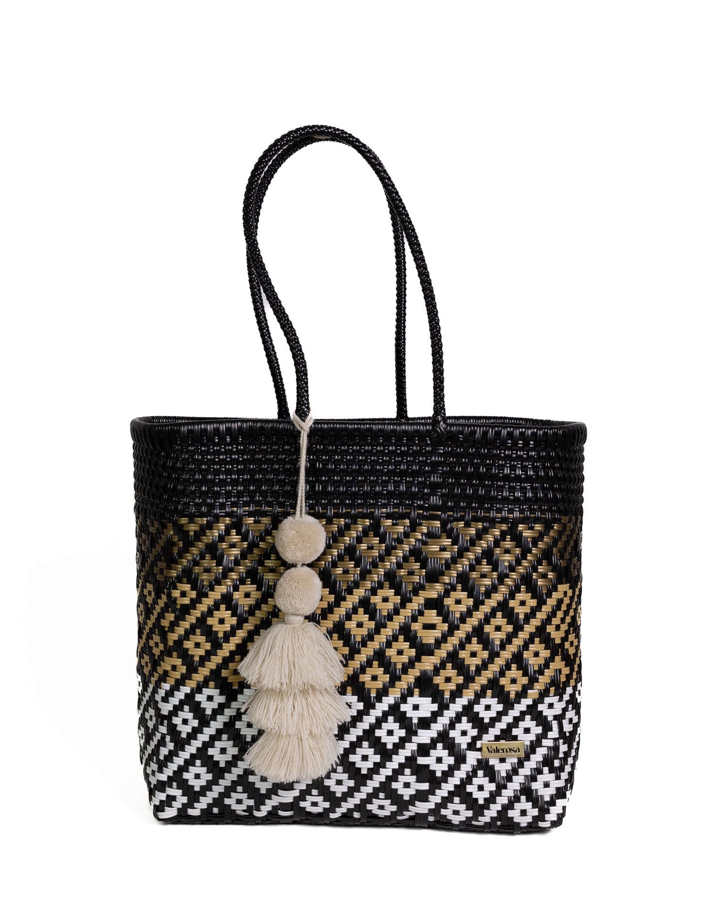 Black, Gold and White is for those who love bold sophistication with a touch of luxury. Featuring a striking gradient of black, gold, and white woven into geometric patterns, this design is both elegant and powerful. Finished with neutral beige pom-pom, it’s a timeless piece that elevates any look.