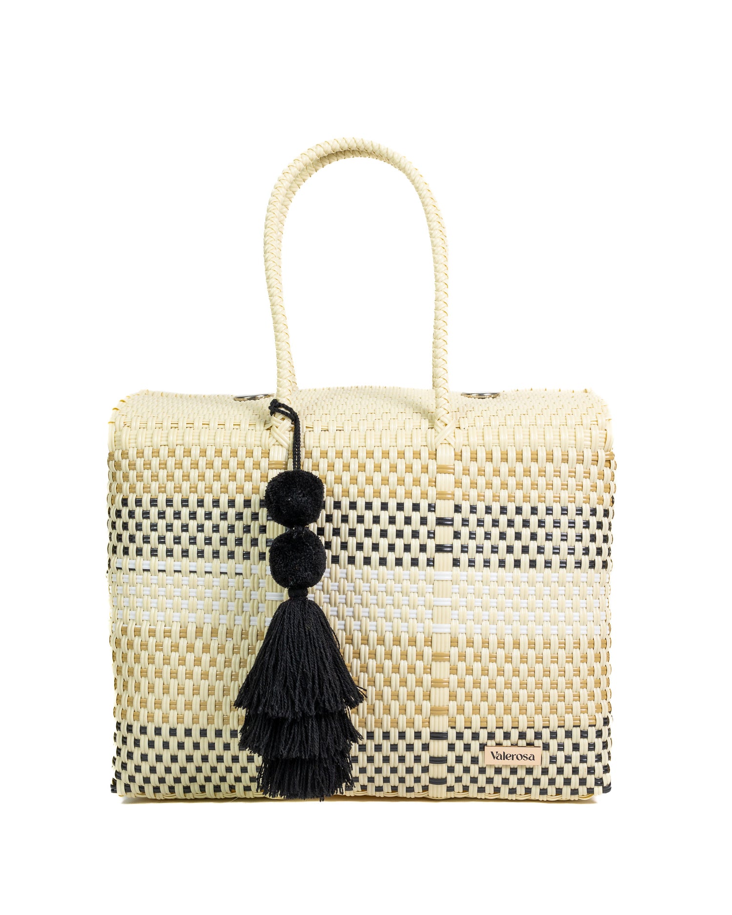 Café con Leche is for the lovers of timeless neutrals with a modern edge. Featuring warm cream tones woven with soft beige and bold black accents, this bag is effortlessly chic and endlessly versatile. Finished with sleek black or brown pom-pom, Café con Leche is the perfect everyday statement—sophisticated, classic, and always in style.