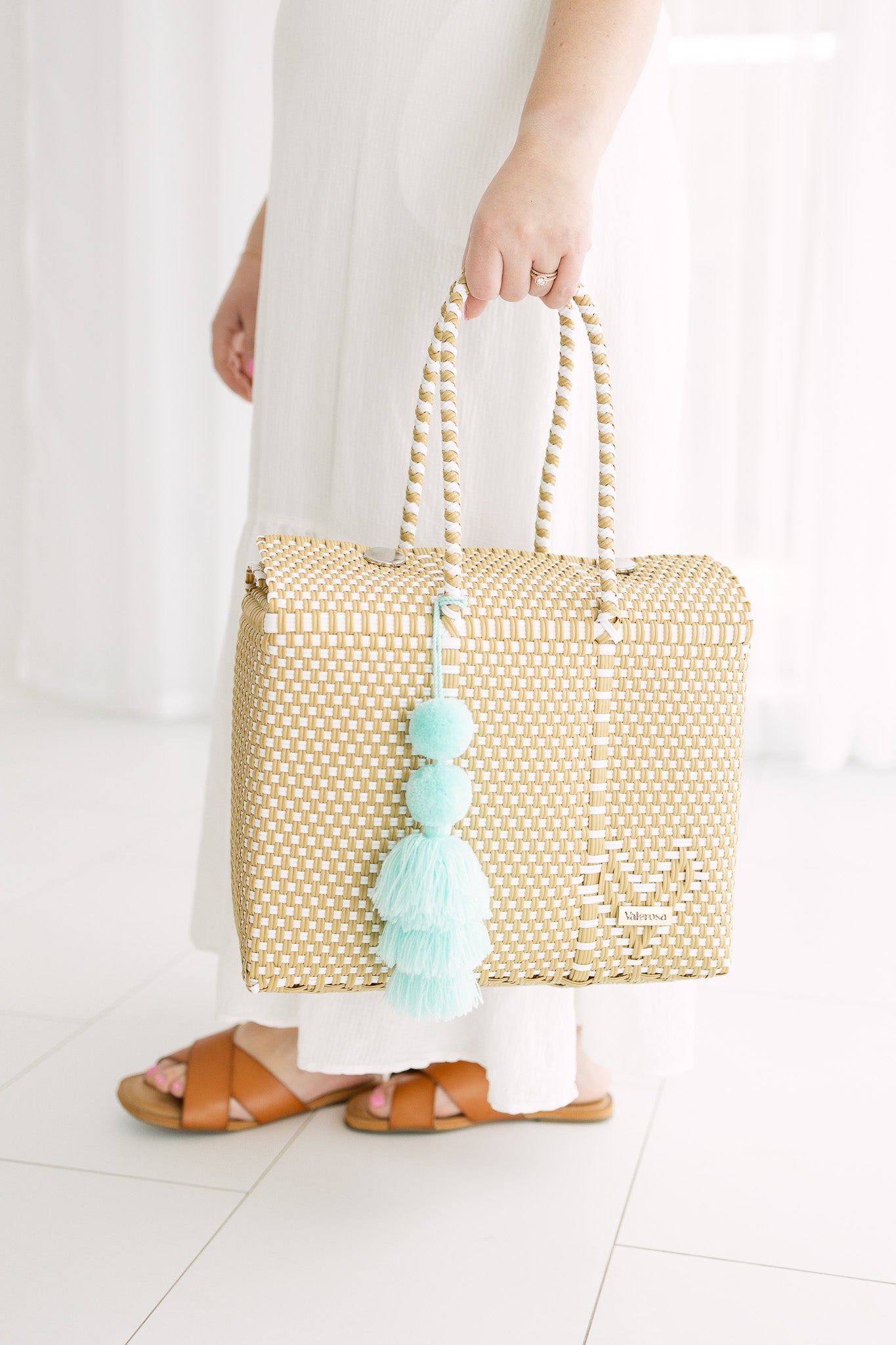 Cappuccino Amore is warm, elegant, and full of charm. Its soft cappuccino and cream weave feels cozy and timeless, while the pop of a aqua pom-pom adds a playful touch of love and freshness. A bag that blends sophistication with sweet whimsy—perfect for carrying a little amore wherever you go.