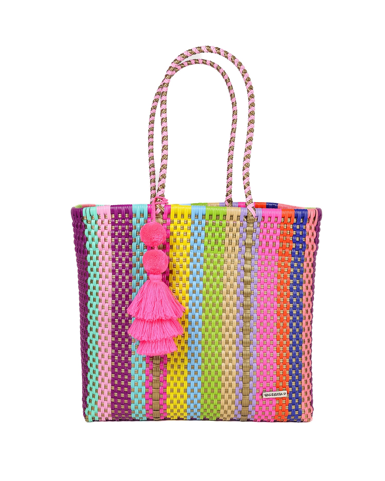 Our totes are colorful, hand-woven Mexican baskets that bring a bright, authentic style to any occasion. This bag is one of our biggest bags. Playera means "beach" in Spanish and this bag is perfect for beach/pool days. Large enough told hold 4 rolled towels, water bottle, book, phone and more! Our bags are made with durable plastic that lasts a lifetime.