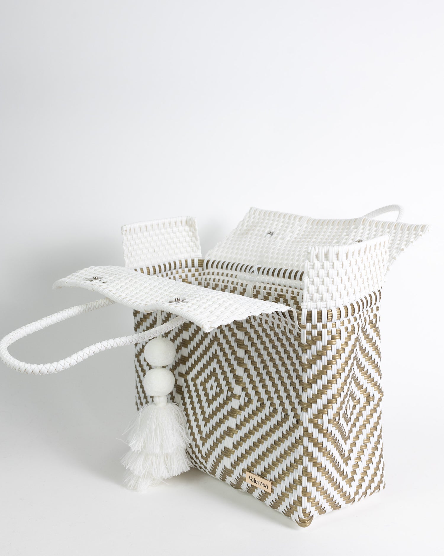 Quiet Luxury is for the ladies who seek classic elegance and versatility but without a low of show. Featuring a crisp white background and gold geometric details, this pattern is sure to compliment any outfit. Finished with a complimentary Pom, this tote is perfect for your next resort getaway.