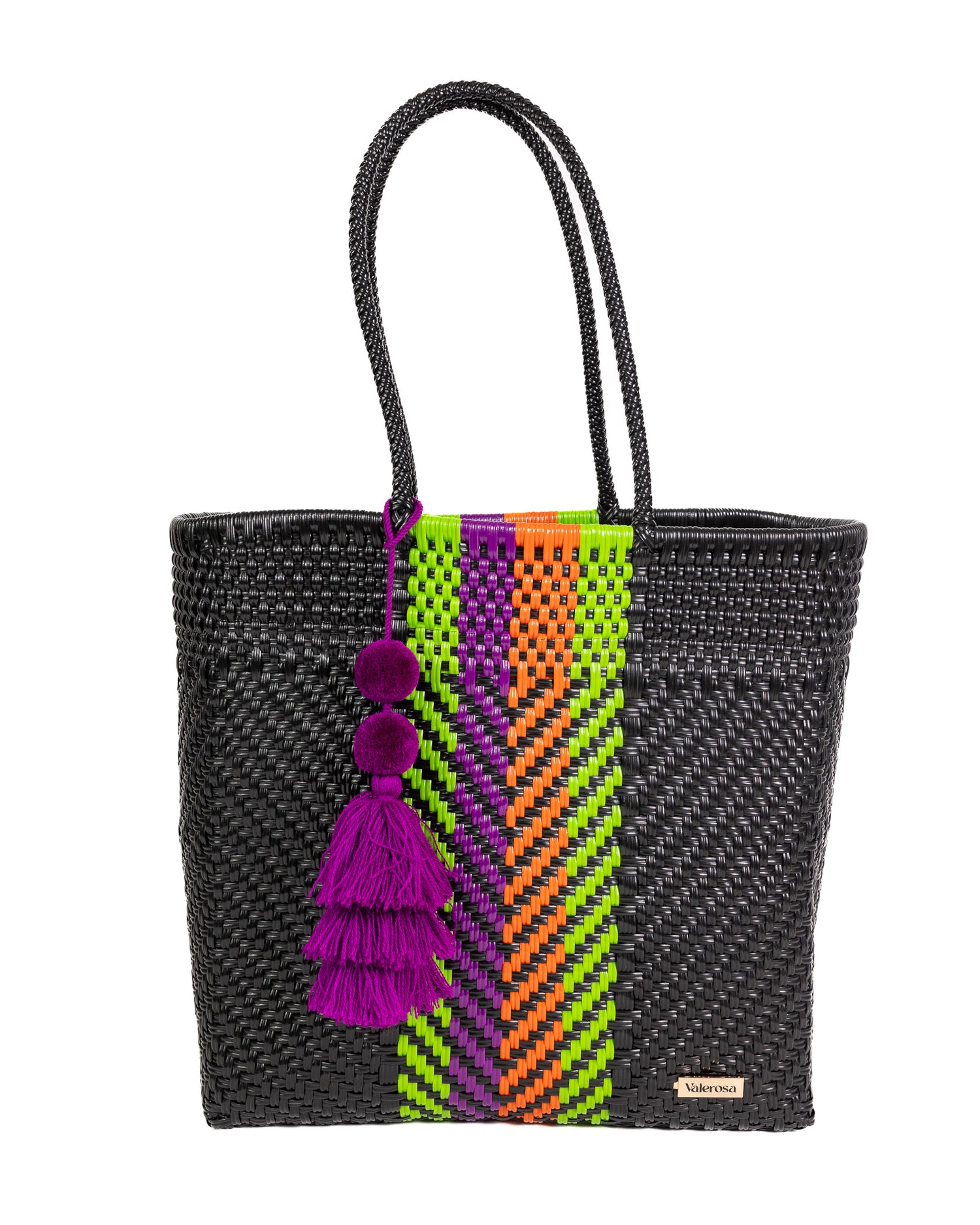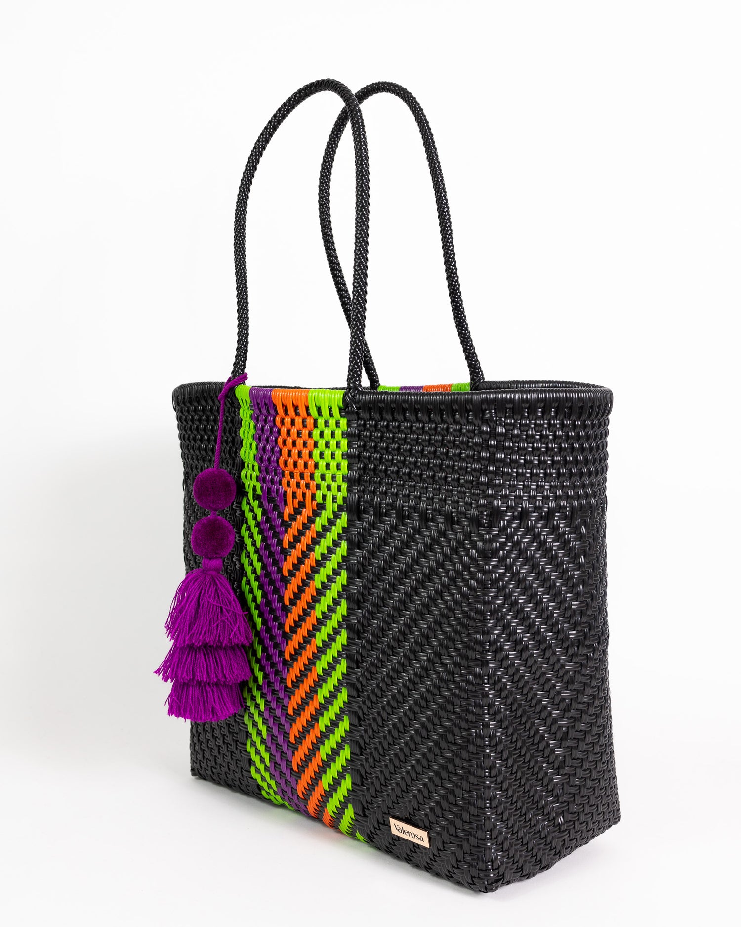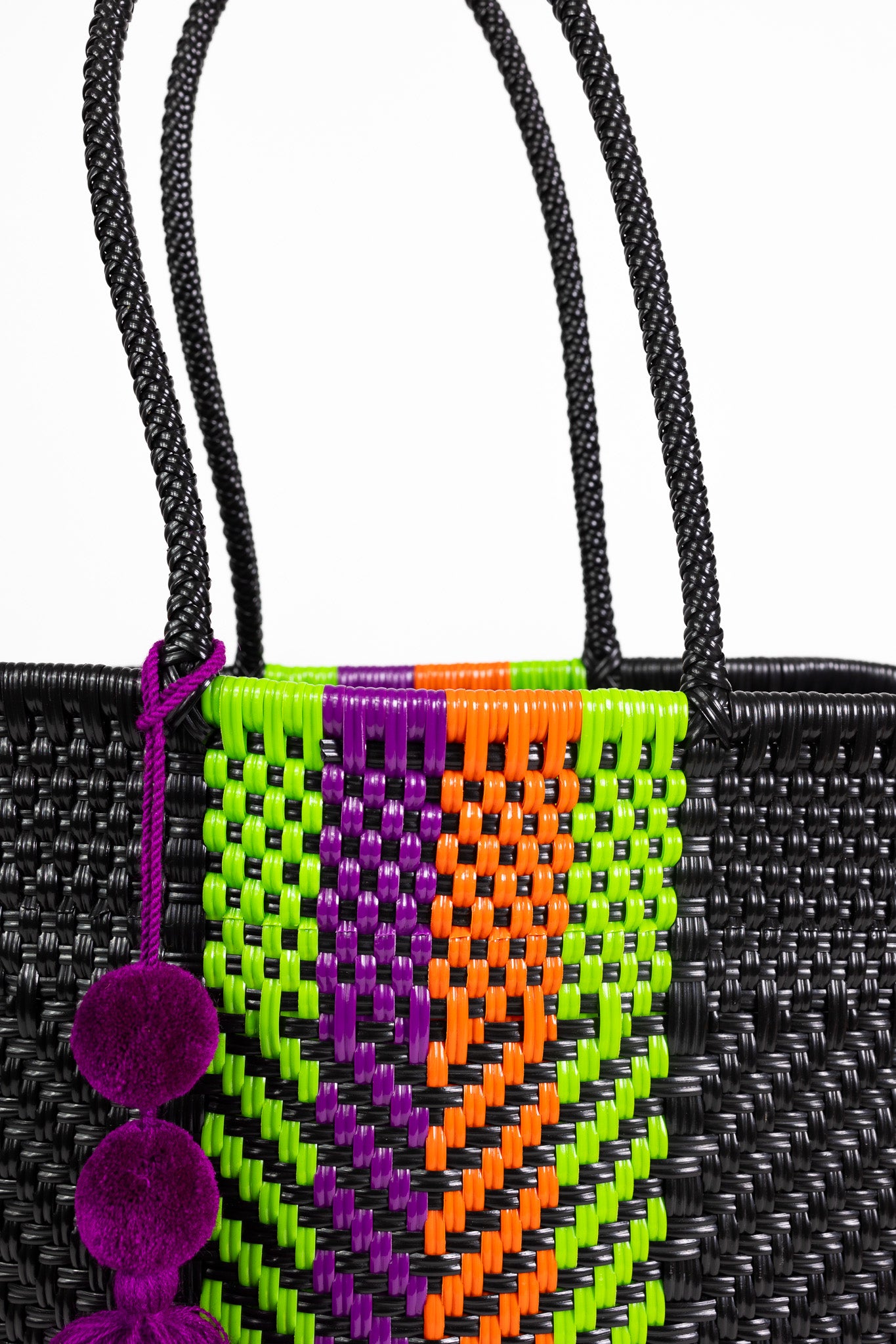 Our biggest tote! Check the dimensions before you buy! Our totes are colorful, hand-woven Mexican baskets that bring a bright, authentic style to any occasion. This tote is big enough for a weekend away. Made with durable plastic that lasts a lifetime.