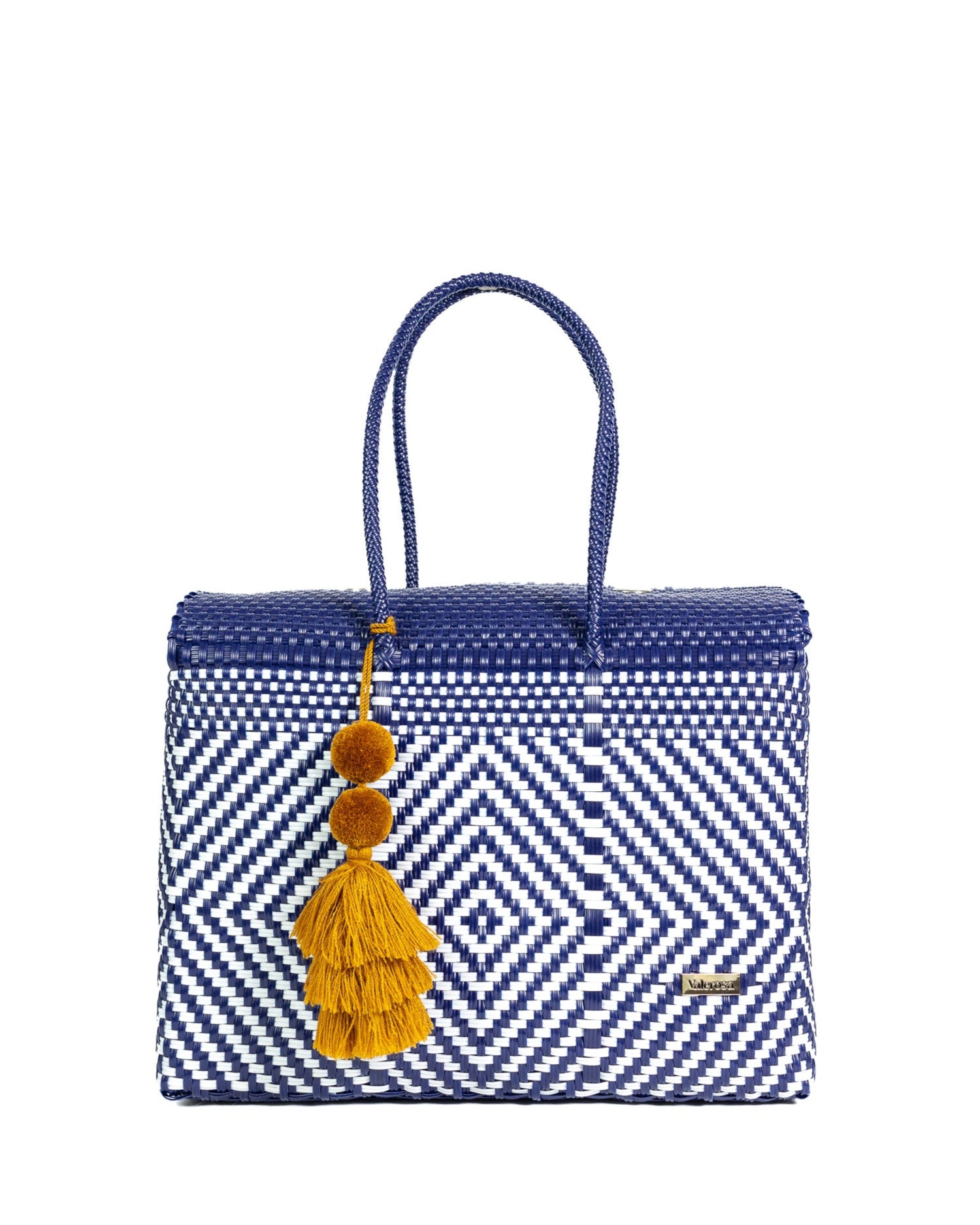Leia is for those who love classic style with a bold twist. Featuring a striking navy and white geometric weave, this design is crisp, strong, and timeless. Finished with bold gold pom-pom, it’s a chic piece that pairs effortlessly with any look.
