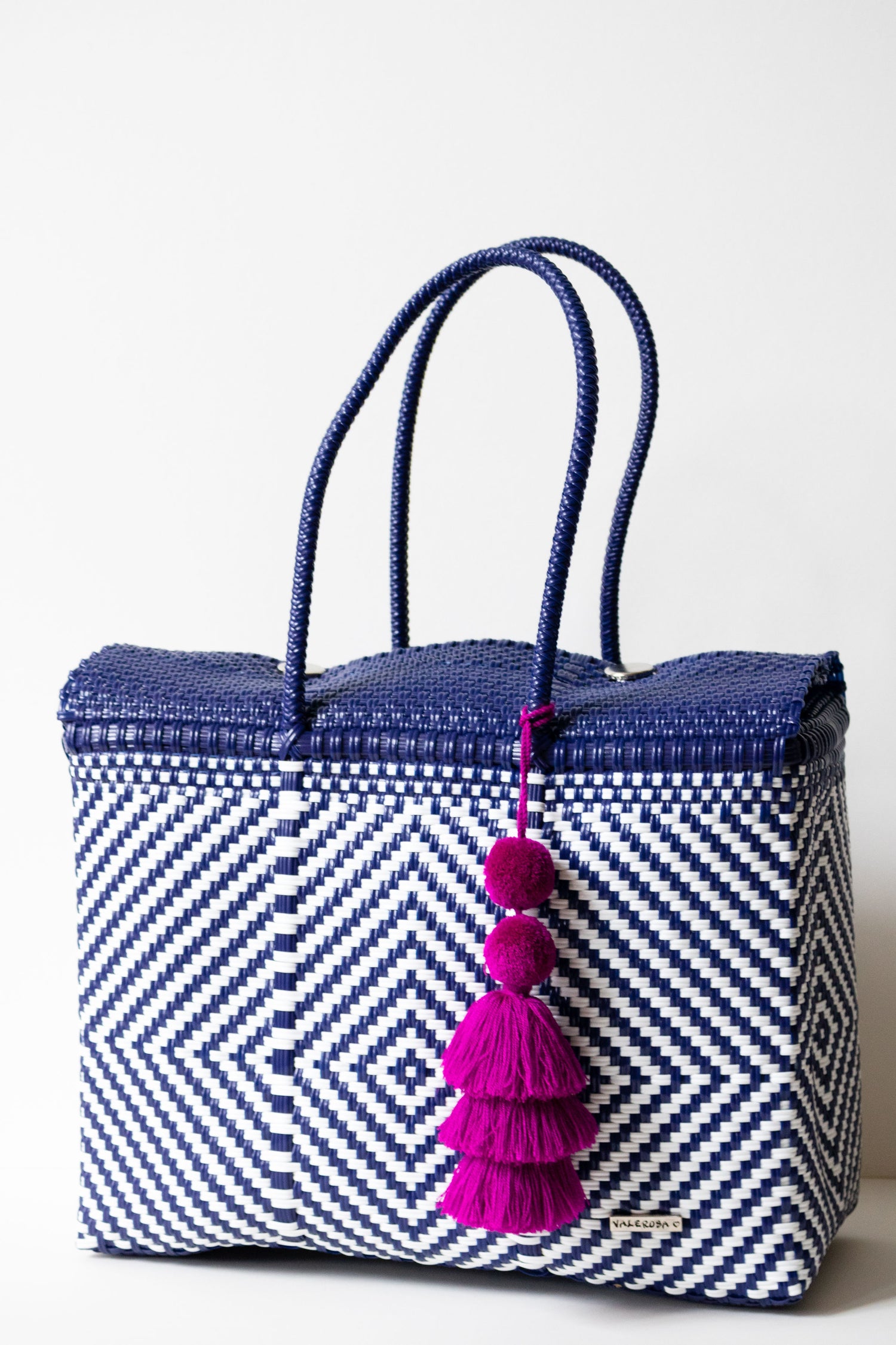 Our bags are colorful, hand-woven Mexican baskets that bring a bright, authentic style to any occasion. This bag is our largest! It is big enough for a weekend away with enough room for 2-3 outfits, shoes, make-up and more! This bag also functions perfectly as a picnic basket. Our bags are made with durable plastic that lasts a lifetime.