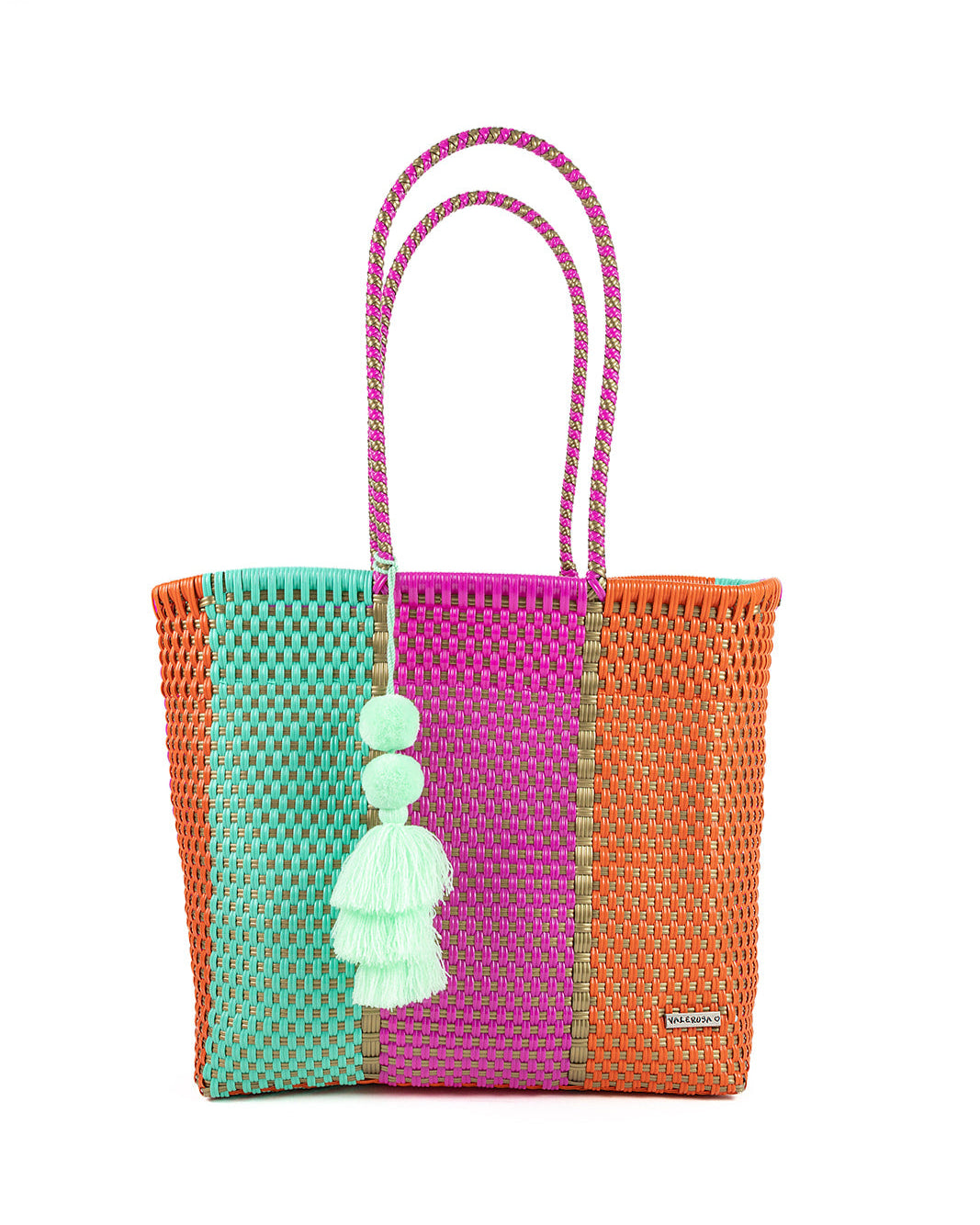 Miami is for the ones who live life like it’s always summer. Featuring bold shades of orange, hot pink, and aqua woven with shimmering gold, this playful pattern brings instant sunshine to any day. Finished with a bright pom-pom, Miami is the ultimate tropical statement bag that radiates fun, color, and joy all year round.