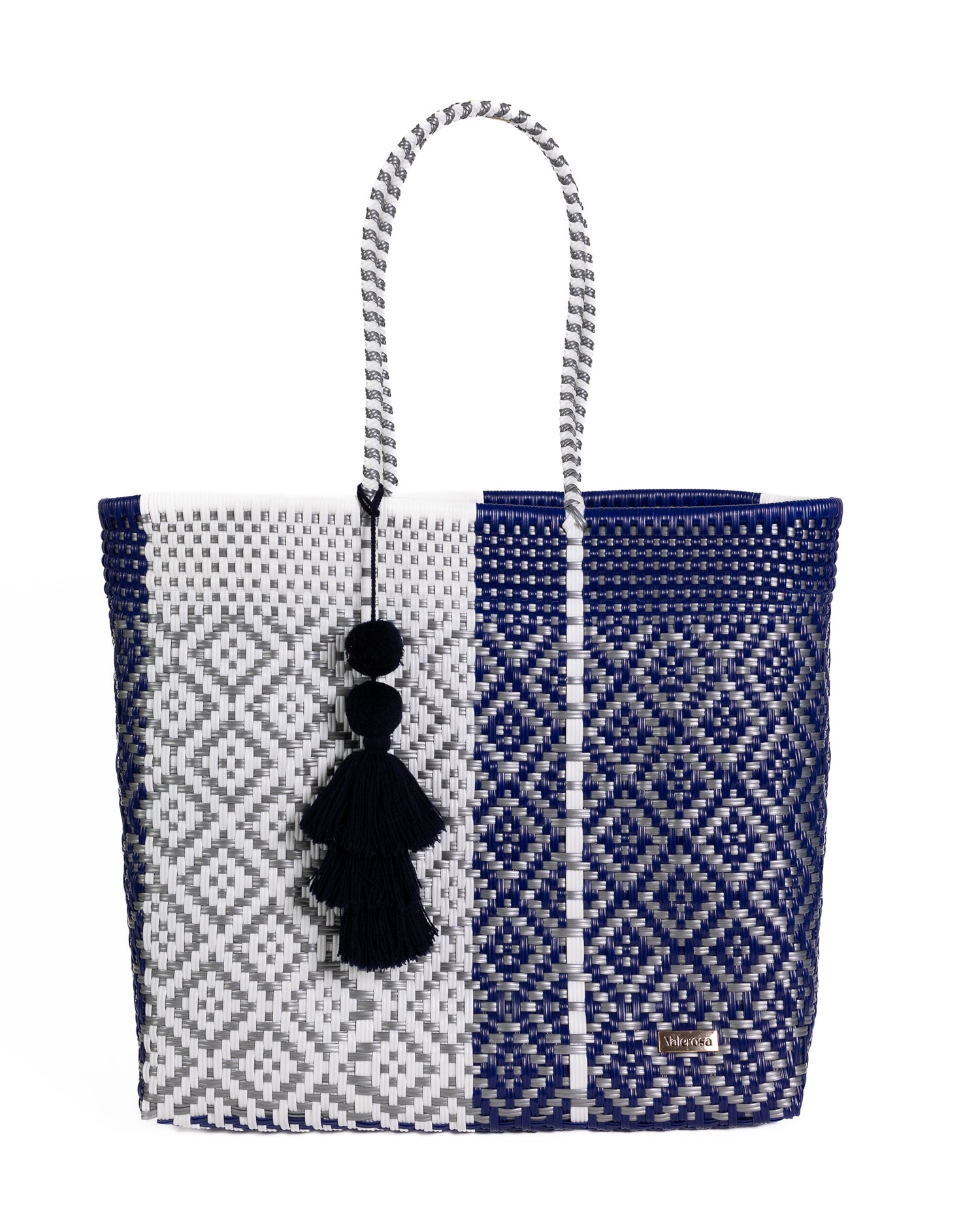 Night and Day is sleek and sophisticated for the ladies who crave versatility with a little shimmer. Featuring a dual tone dark blue and white pattern interwoven with silver geometric diamonds throughout. This pattern is a true classic add a little sparkle to your everyday jeans and t-shirt. Finished with a complimentary Pom, this tote is perfect for running errands and beating the rest of the mom to the front of carpool.