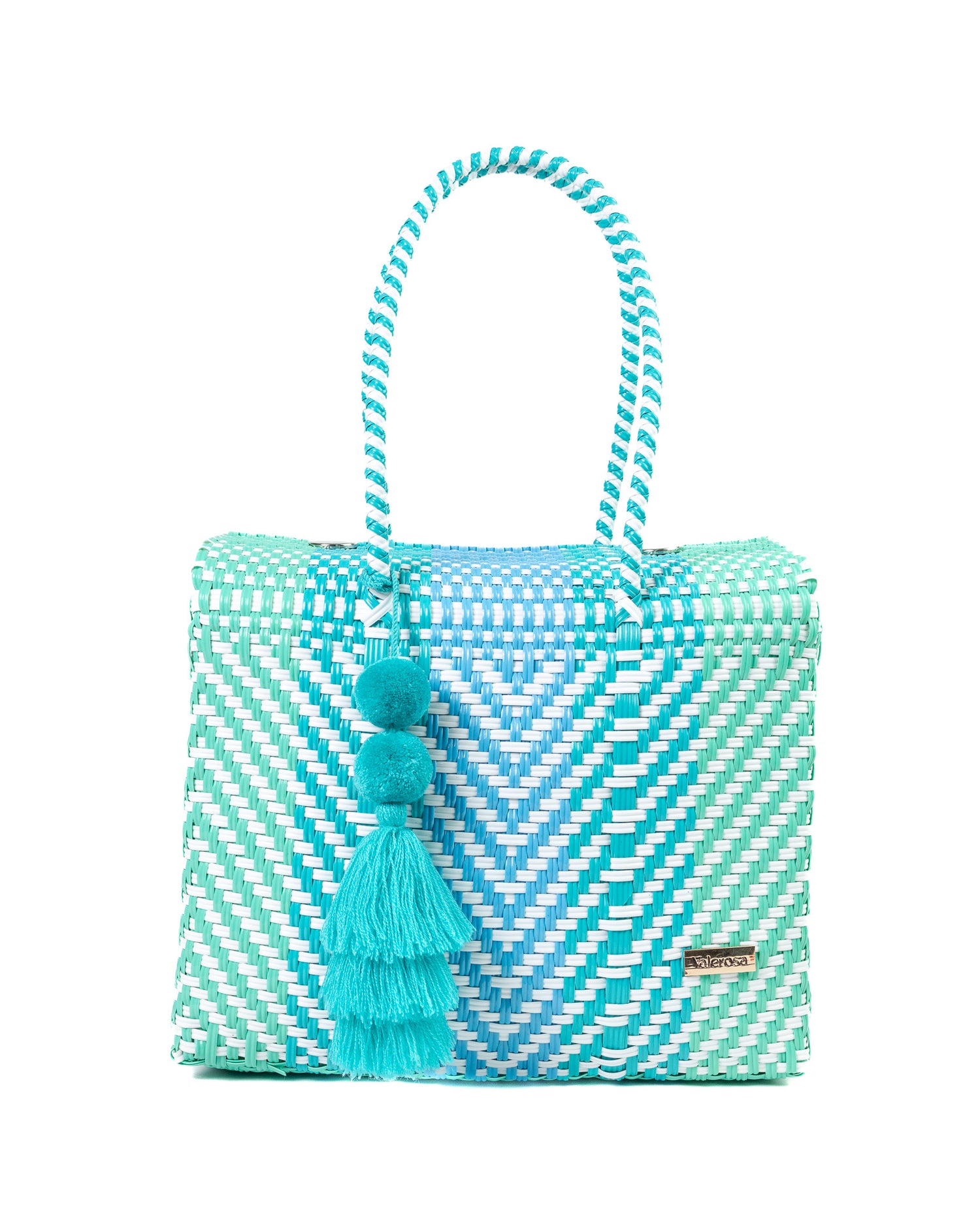Ocean Blvd is for the beach lovers and sun chasers who feel most at home by the sea. Featuring refreshing shades of aqua, turquoise, and white woven into wave-like patterns, this bag is as breezy as a coastal escape. Finished with ocean-blue or white pom-pom, Ocean Blvd is the ultimate seaside companion, bringing laid-back elegance to every adventure.
