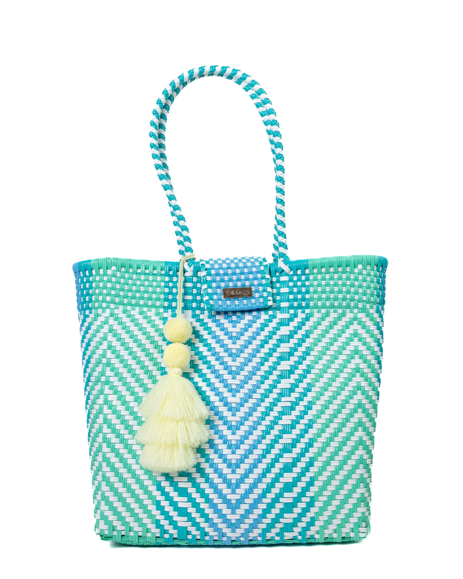 Ocean Blvd is for the beach lovers and sun chasers who feel most at home by the sea. Featuring refreshing shades of aqua, turquoise, and white woven into wave-like patterns, this bag is as breezy as a coastal escape. Finished with ocean-blue or white pom-pom, Ocean Blvd is the ultimate seaside companion, bringing laid-back elegance to every adventure.