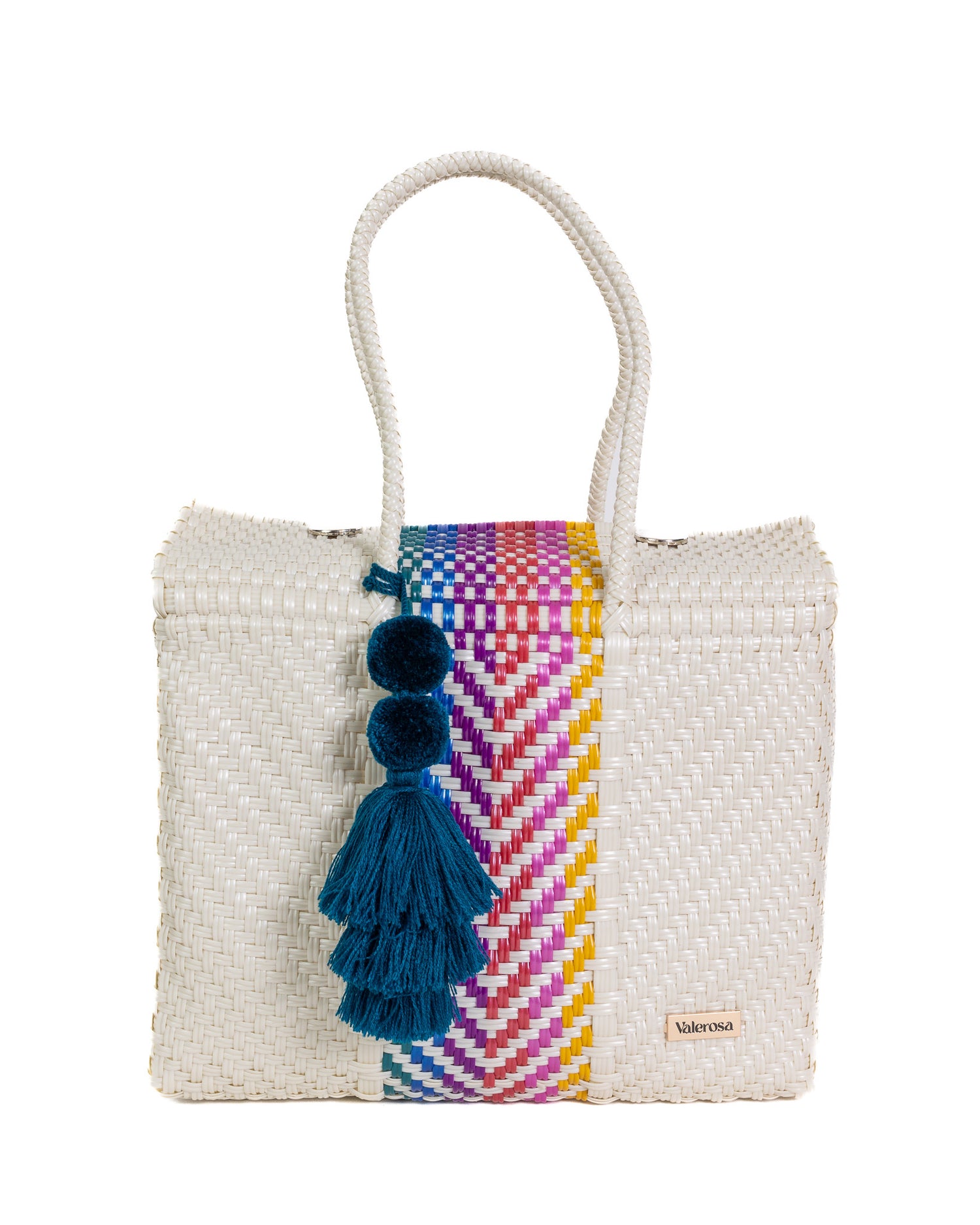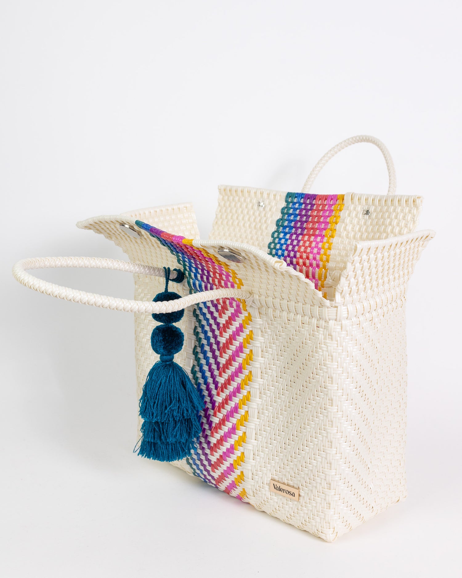 Our totes are colorful, hand-woven Mexican baskets that bring a bright authentic Mexican style to any occasion. Día means "day" in Spanish and this bag is perfect for daily use. The Día bag tote is enough for all your essentials (think lunchbox, laptops, file folders, etc.). Made with durable plastic that lasts a lifetime.