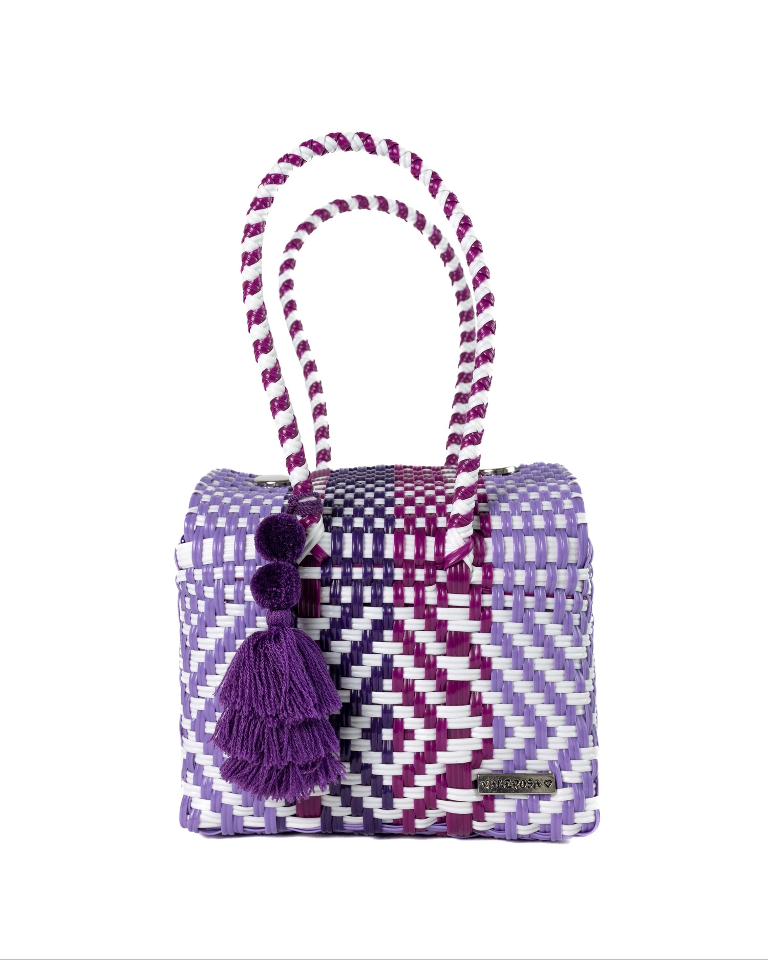 Plum Purple is for the lovers of elegance with a bold twist. Featuring rich shades of violet, plum, and crisp white woven into striking geometric patterns, this bag is both timeless and modern. Finished with deep purple pom-pom, Plum Purple brings a touch of sophistication and vibrancy to your everyday style.