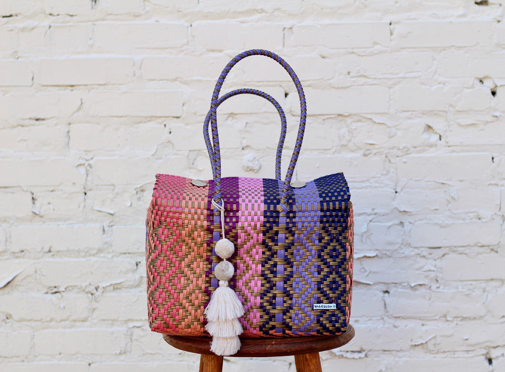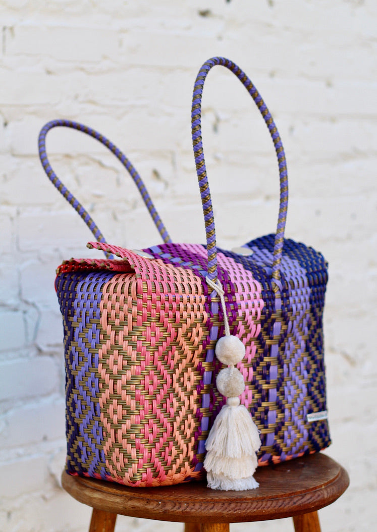 Our totes are colorful, hand-woven Mexican baskets that bring a bright authentic Mexican style to any occasion. Día means "day" in Spanish and this bag is perfect for daily use. The Día bag tote is enough for all your essentials (think lunchbox, laptops, file folders, etc.). Made with durable plastic that lasts a lifetime.