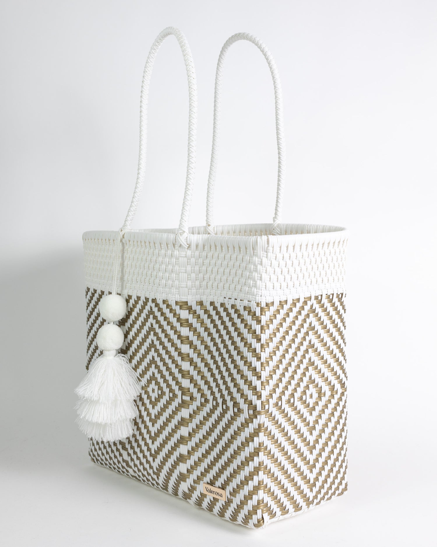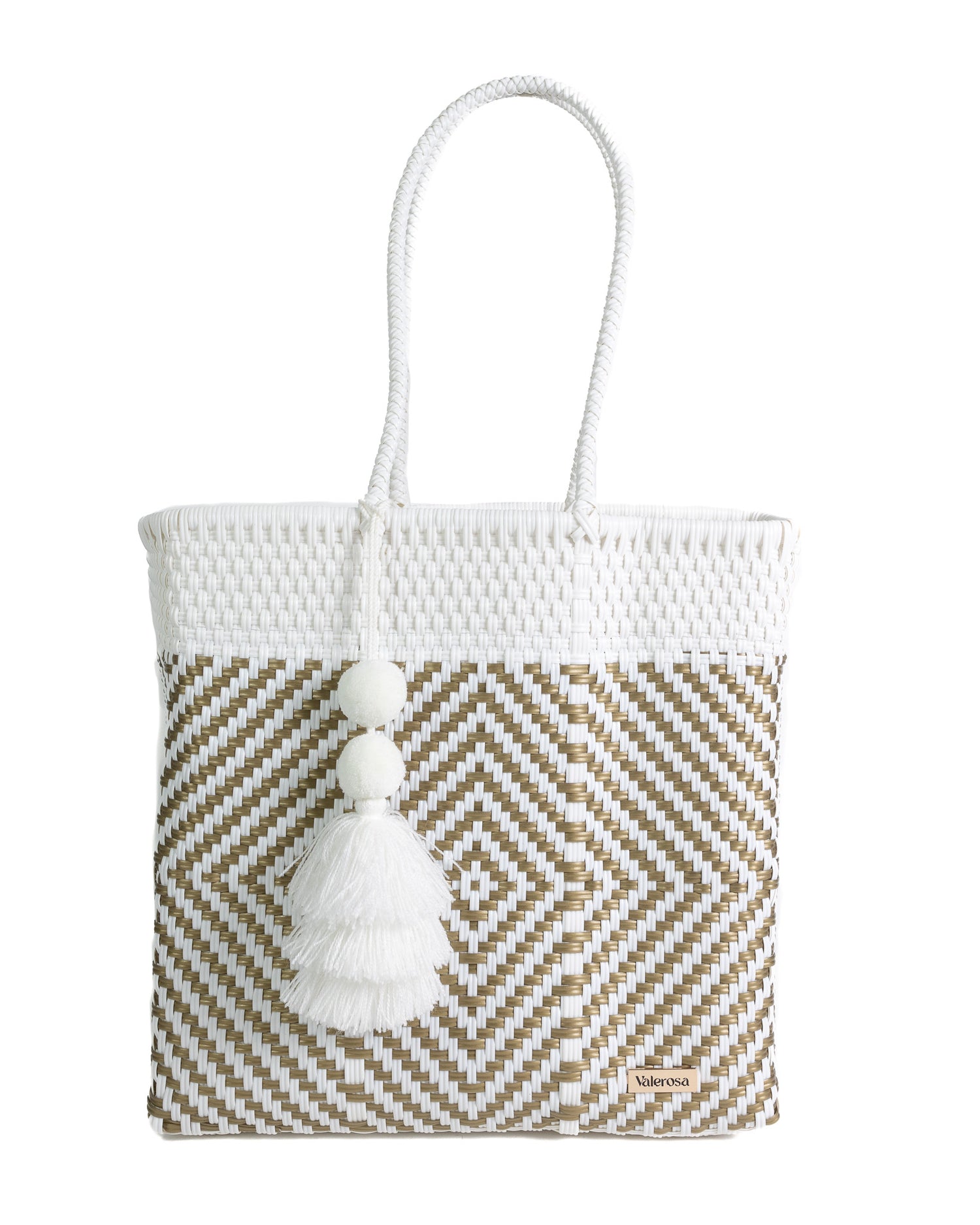 Quiet Luxury is for the ladies who seek classic elegance and versatility but without a low of show. Featuring a crisp white background and gold geometric details, this pattern is sure to compliment any outfit. Finished with a complimentary Pom, this tote is perfect for your next resort getaway.