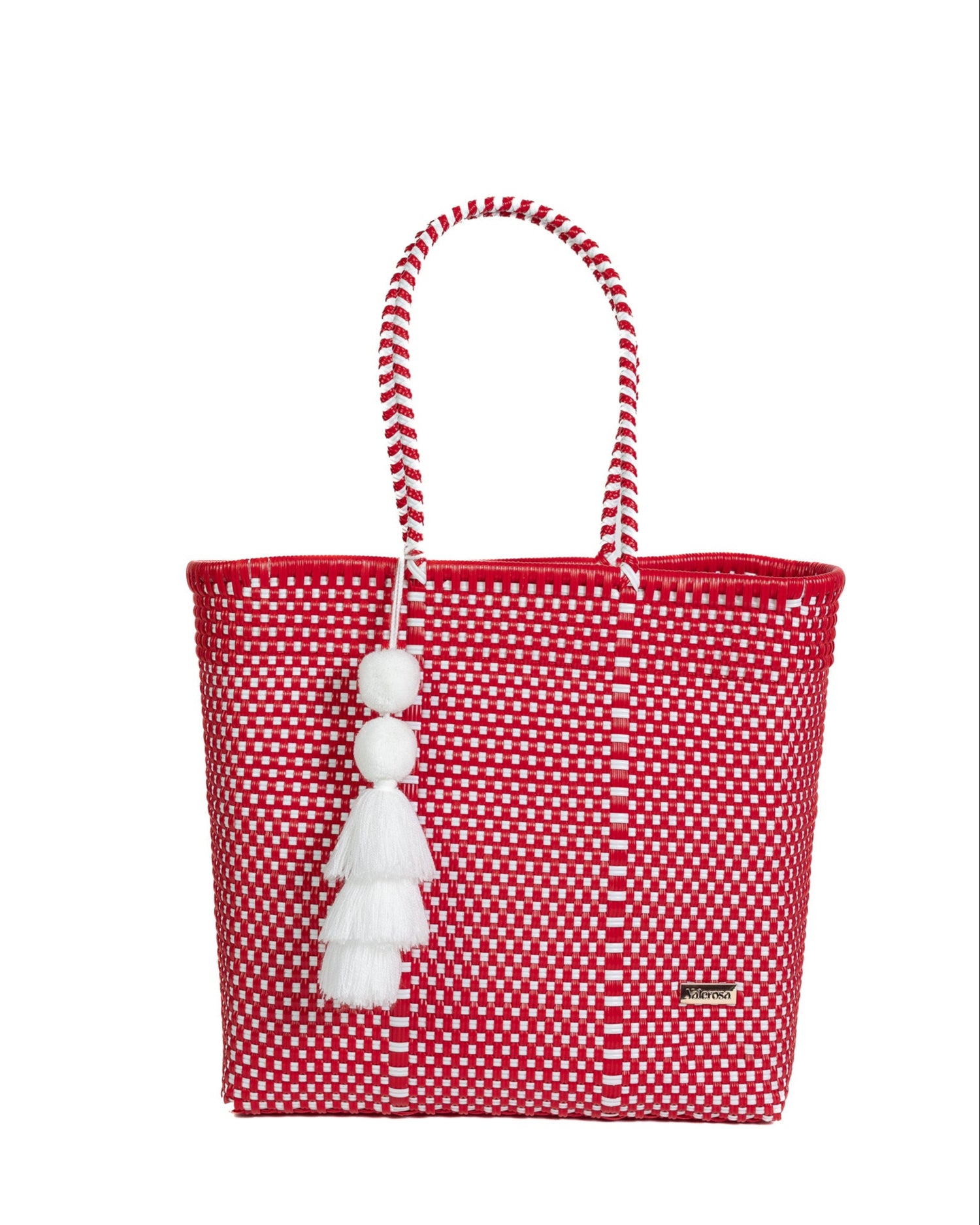 Our totes are colorful, hand-woven Mexican baskets that bring a bright, authentic style to any occasion. This bag is one of our biggest bags. Playera means "beach" in Spanish and this bag is perfect for beach/pool days. Large enough told hold 4 rolled towels, water bottle, book, phone and more! Our bags are made with durable plastic that lasts a lifetime.