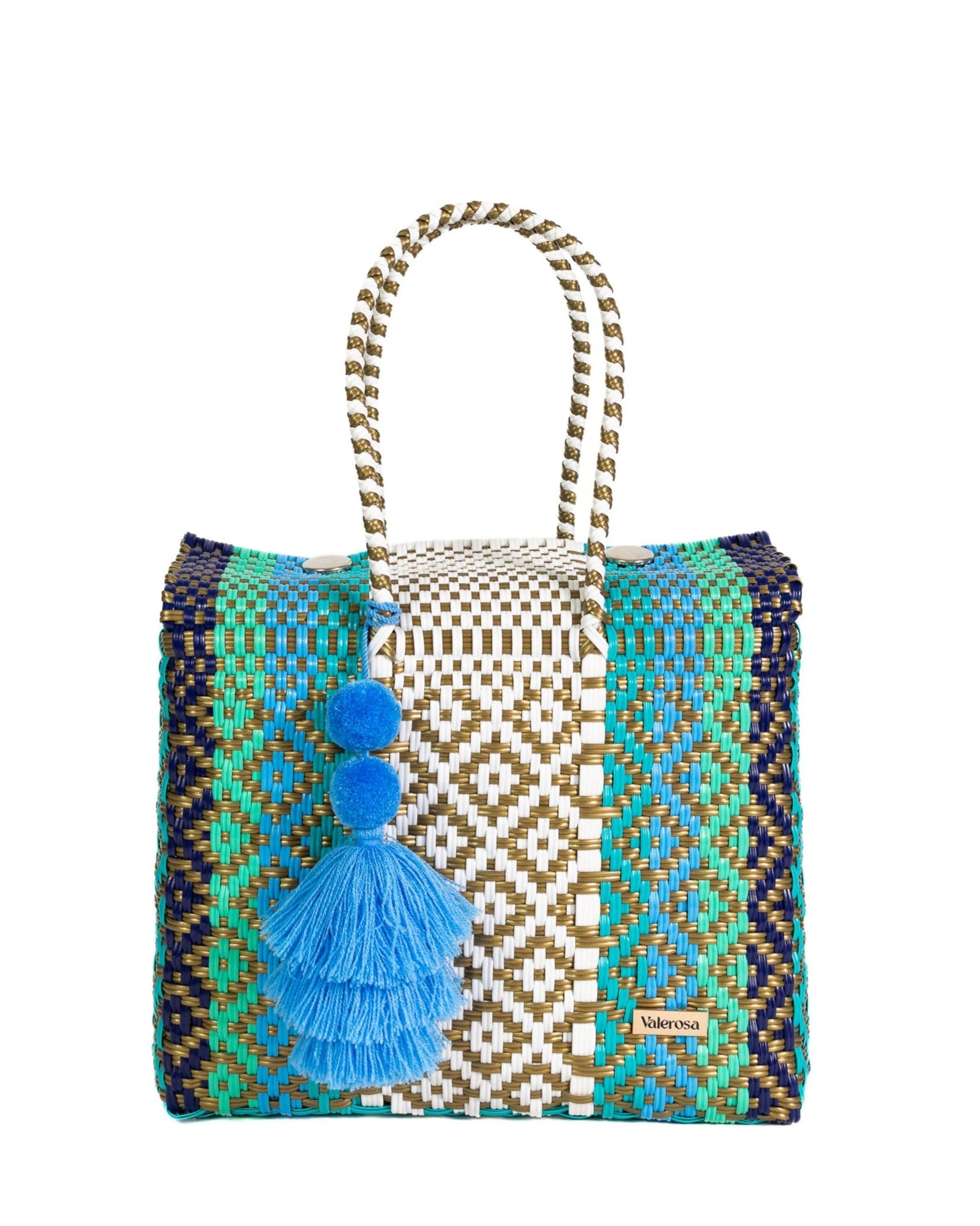 Waves is for the free spirits who flow with the rhythm of the ocean. Featuring rich shades of teal, aqua, navy, and sandy gold woven into intricate patterns, this bag captures the essence of rolling tides and sunlit shores. Finished with bright pom-pom, Waves is the perfect companion for those who carry the sea’s energy wherever they go.