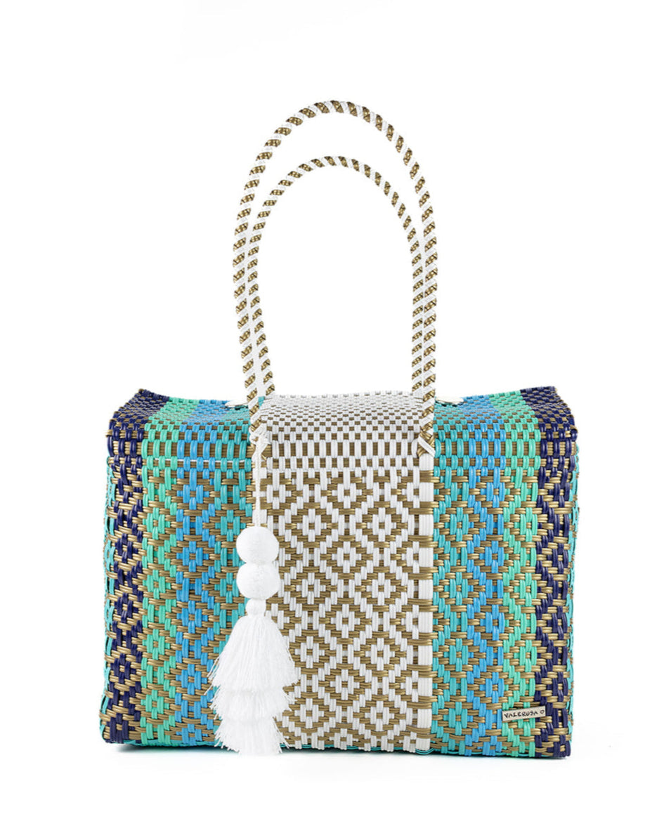 Waves is for the free spirits who flow with the rhythm of the ocean. Featuring rich shades of teal, aqua, navy, and sandy gold woven into intricate patterns, this bag captures the essence of rolling tides and sunlit shores. Finished with bright pom-pom, Waves is the perfect companion for those who carry the sea’s energy wherever they go.