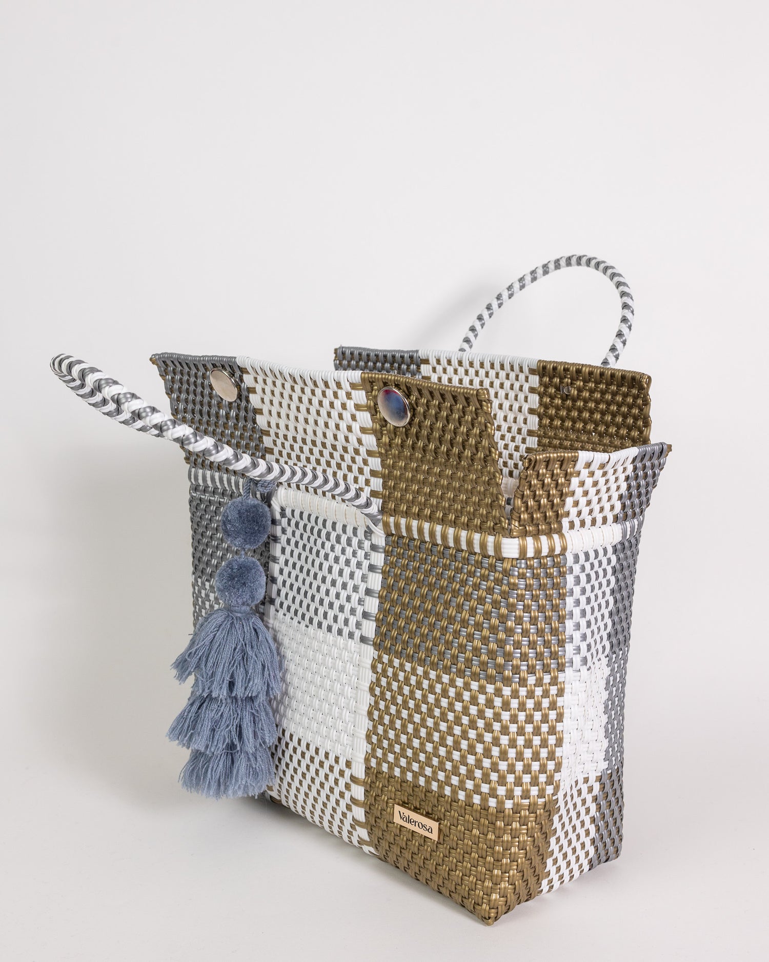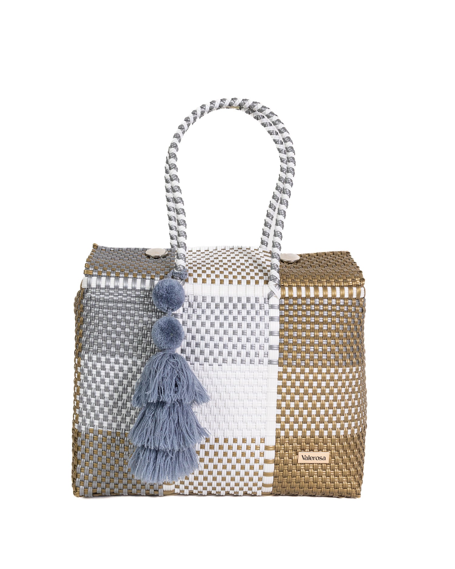 Winter Solace captures quiet elegance in every detail. With a harmonious blend of frosted silver, crisp white, and warm gold tones, its woven design reflects the calm beauty of winter days touched by light. Finished with soft neutral pom-pom, this bag brings a sense of comfort and sophistication — perfect for serene escapes or adding a polished touch to your everyday look.